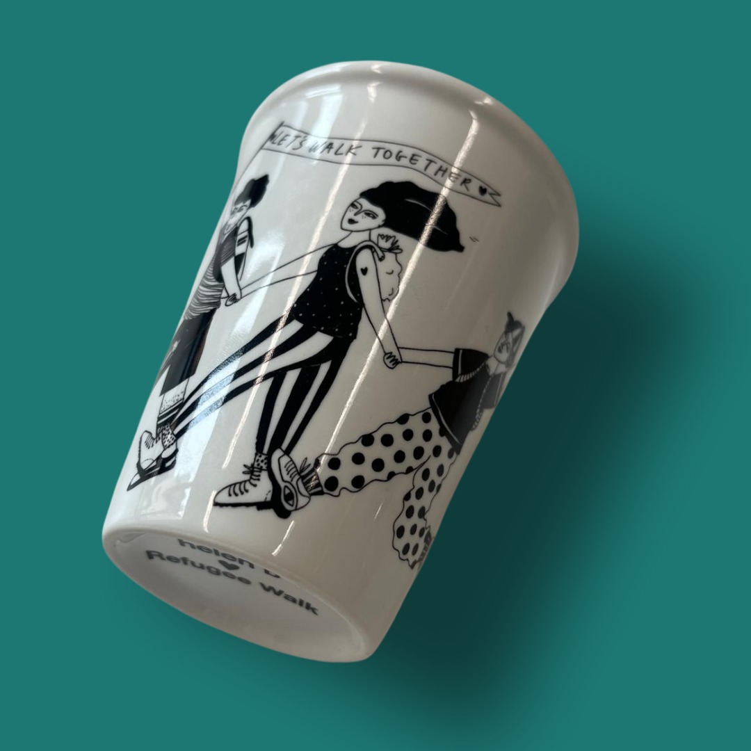 Voor de tiende editie van de Refugee Walk, ontwierp de Gentse illustrator helen b deze exclusieve mok. De porseleinen tas toont drie vrolijke wandelende figuurtjes met de boodschap 'Let’s walk together' – een krachtige oproep tot verbondenheid en solidariteit.
